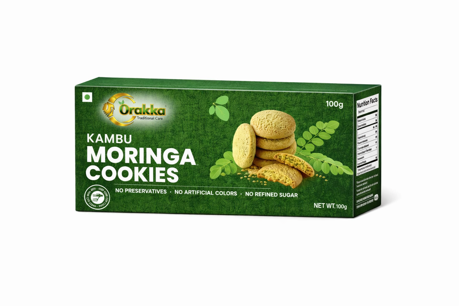 Moringa is widely known as a superfood rich in vitamins, minerals, and antioxidants, while Kambu (Pearl Millet) is an ancient grain valued for its high fibre and natural energy. Together, they create a wholesome cookie that supports a healthy lifestyle while delivering a satisfying crunch.